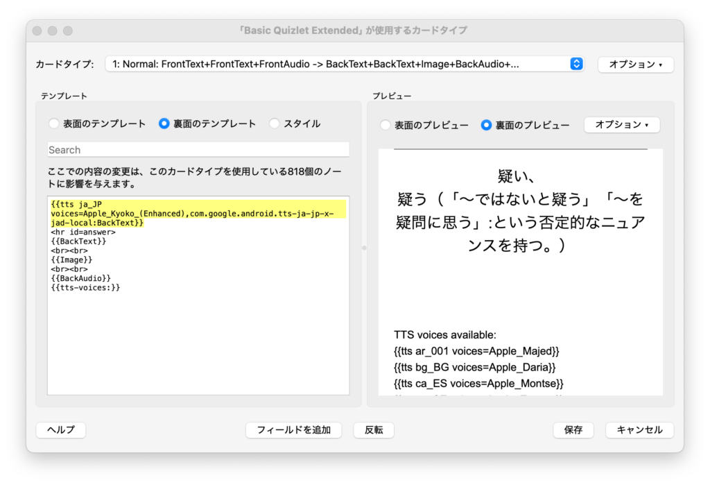 裏面のテンプレートには日本語を使用しています。日本語用TTSとしては、Mac用にはApple_Kyoko_(Enhanced)、Androidにはcom.google.android.tts-ja-jp-x-jad-localを使用しました。次のように行を追加してください。