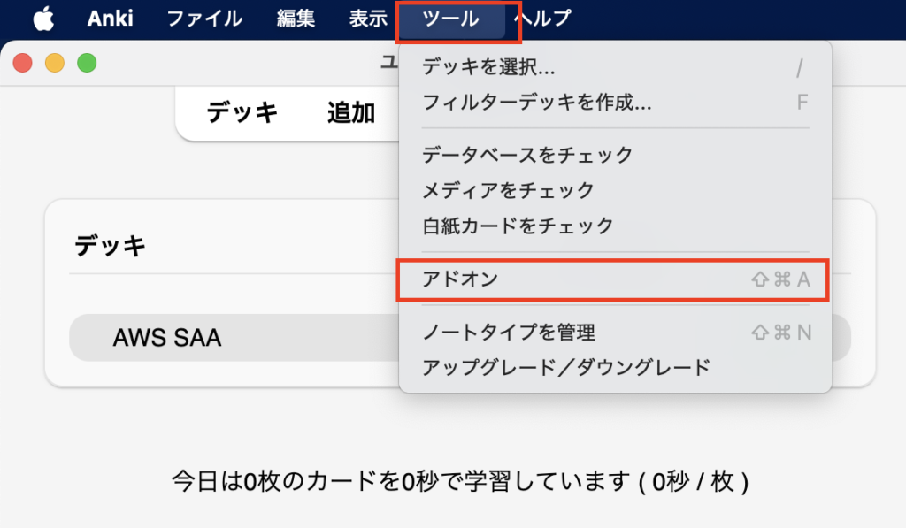 Ankiを開いて、ツールから、アドオンを選択します。