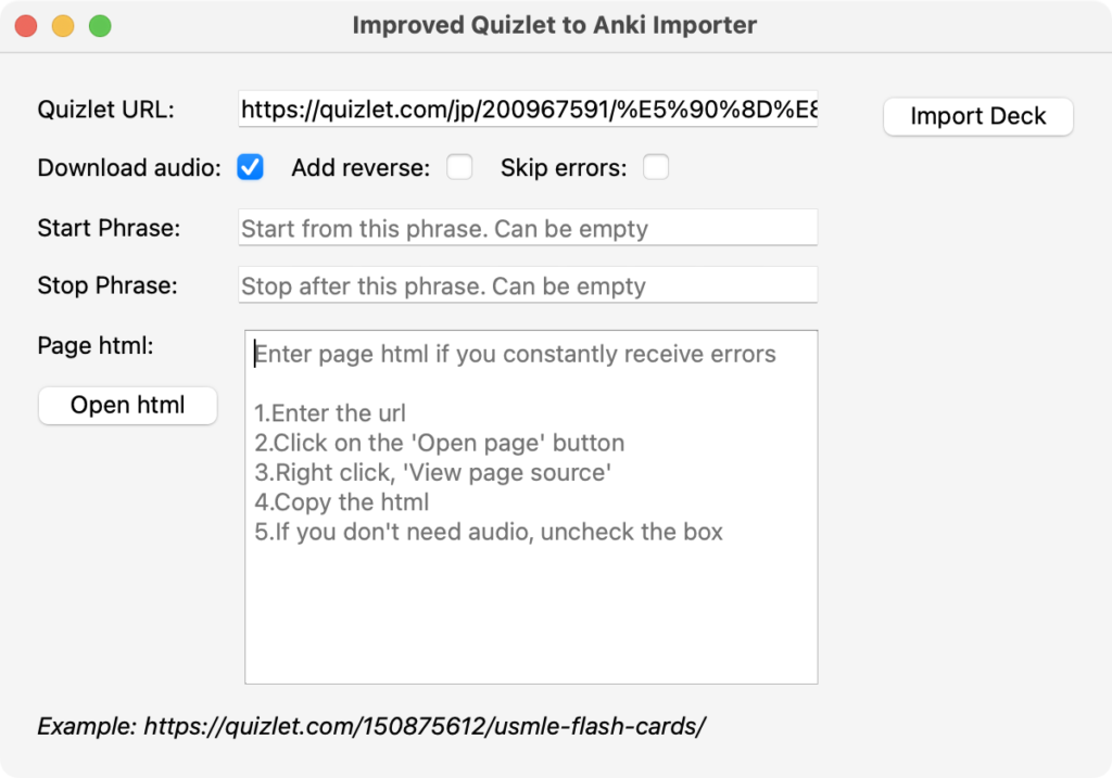 - Quizlet URL: インポートしたい単語帳のURLを指定します。