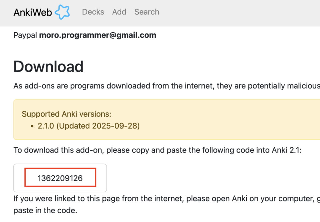 AnkiはすでにMacにインストールしてあります。次の手順はExtensionの導入方法です。上記サイトのDownloadセクションに記載のあるコード(赤枠で示したところ)をコピーします。