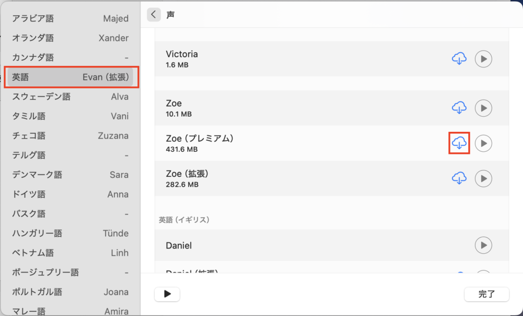 なお、TTSは事前に端末にダウンロードされている必要があります。Macの場合は、「システム設定」→「システムの声」の(i)マークでダイアログを開き、言語を選びます。一覧で使いたい音声を選択し、もし雲マークが付いている場合まだダウンロードされていないので、クリックしてダウンロードします。