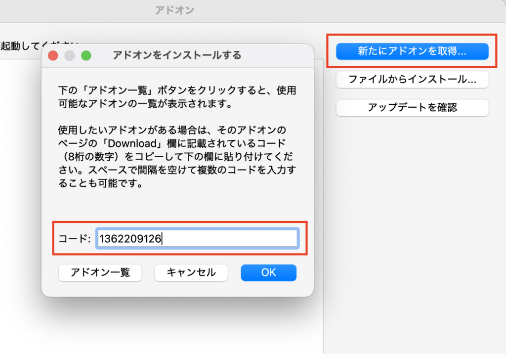 「アドオン」のダイアログが開いたら「新たにアドオンを取得…」を押して「コード」に、先程コピーしたコードをペーストしてOKを選択します。